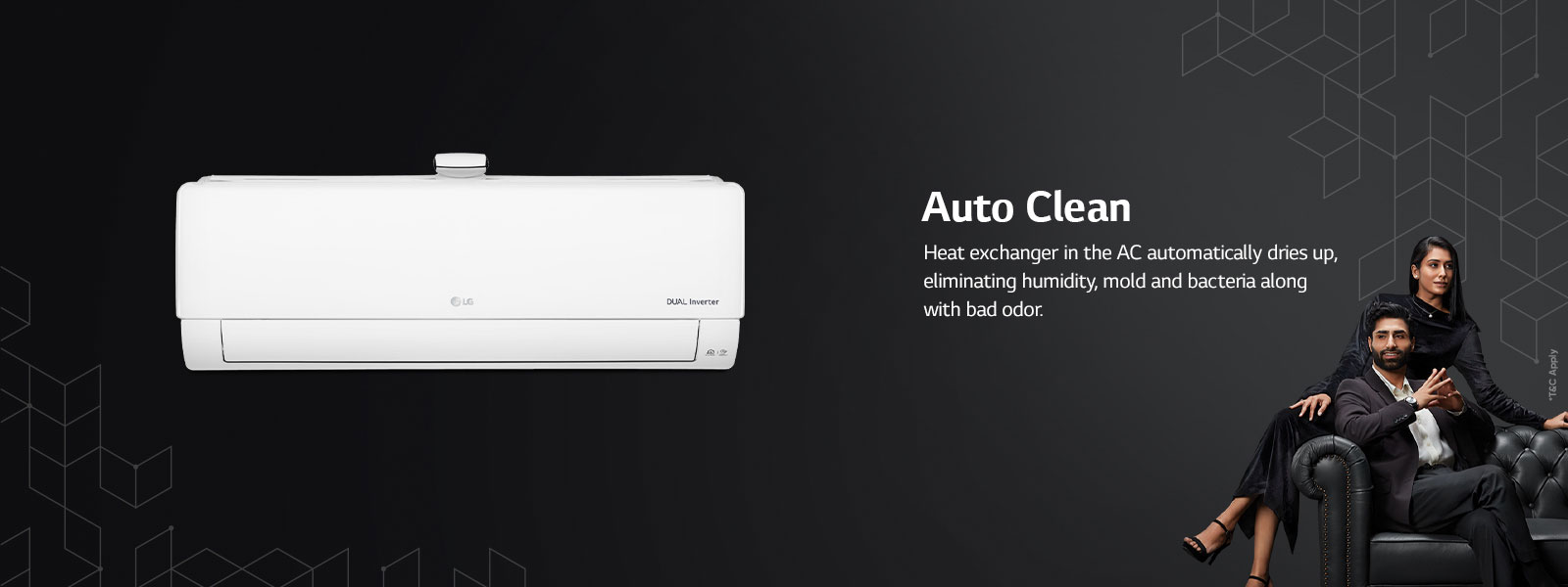 LG DUAL Inverter Air Conditioner now comes with an ‘Anti-Virus’ protection layer fitted HD Filter. The filter mesh is coated with Cationic Silver Ions (AgNPs) that deactivates more than 99% Virus and bacteria in contact. To be precise, it demobilizes up to 99.76% Virus and up to 99.99% bacteria cleansing.