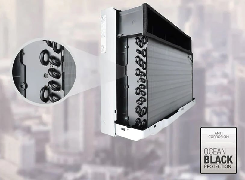 Special Ocean Black Protection applied on copper tubes provides exceptional durability for the air conditioner in typical Indian regions affected from sand, salt, industrial smoke and pollutants.