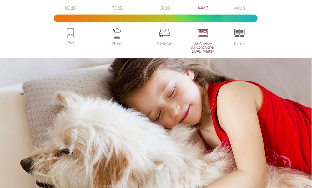 LG window air conditioners operate at sound levels as low as 44dB, thanks to LG's unique BLDC Motor and DUAL Inverter Compressor, eliminating unnecessary noise for smooth operation that you'll barely notice.