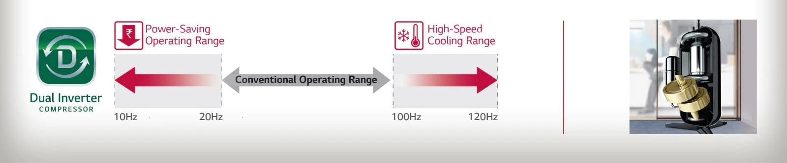 LG's DUAL Inverter Compressor with Varied Speed Dual Rotary Motor has a wider rotational frequency which saves more energy along with higher speed cooling range than conventional compressors. This ensures that our DUAL Inverter ACs cool faster, last longer and run quieter.