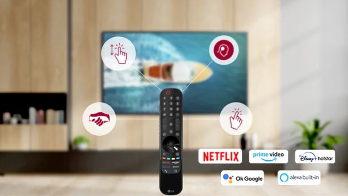 The redesigned Magic Remote has an ergonomic design that's easy to hold, and its point and scroll system allows faster searching. Built-in AI provides easy access to services, while hotkeys for major content providers give you shortcuts to all your favorites.