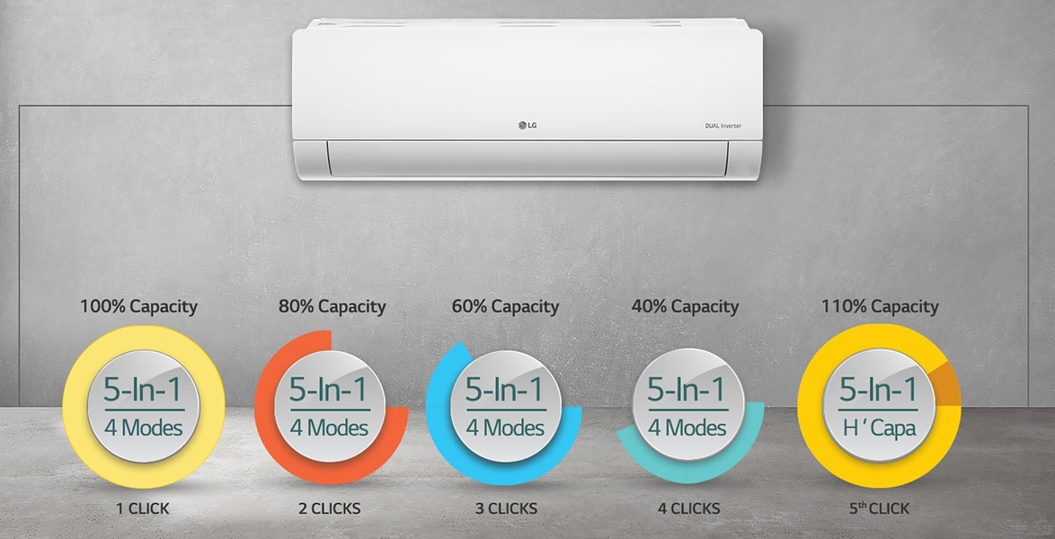 LG DUALCOOL AC with Super Convertible 5-in-1 Cooling Control, you can not only save a lot of energy by stepping down the cooling capacity from 100 Percent to 80 Percent, 60 Percent or 40 Percent, but even increase the cooling capacity to 110 Percent when faster cooling becomes most important.