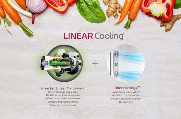 LG Door Cooling+ makes inside temperature more even and cools the refrigerator 35% faster than the conventional cooling system. This reduces the temperature gap between the inner part and the door side of the compartment; thus letting the food remain fresh for long.