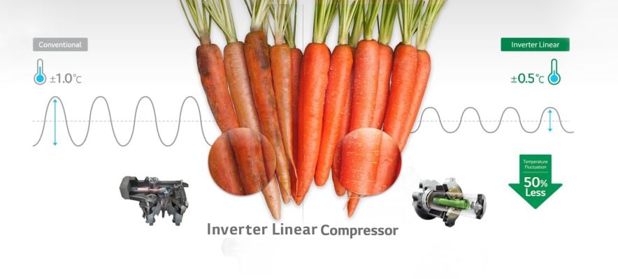ILC Functions within a temperature range of ±0.5°C, that’s almost half the temperature variation as compared to the conventional compressor. It reduces noise by 25%, comes with 10 year warranty and is certified for a lifespan of 20 years. Not just this, LG comes with 51% energy saving in refrigerator with ILC.