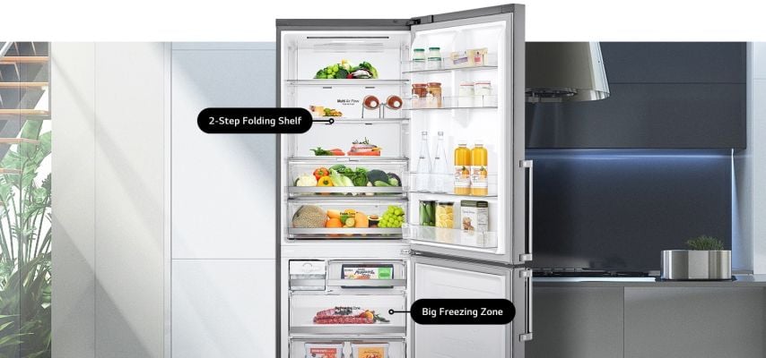 This nifty bottom mount fridge features a 2-Step Folding Shelf for tall bottles and a Chilled Compartment which helps reduce the need to freeze and defrost certain items.