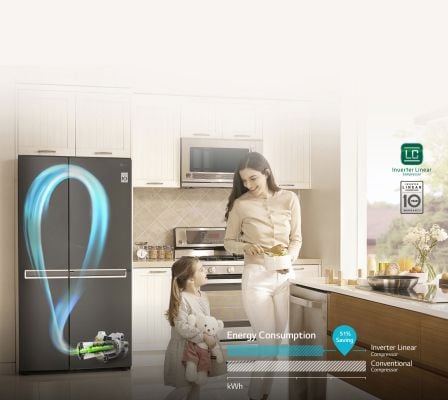 LG's unique Inverter Linear Compressor uses a linear piston drive instead of a conventional reciprocating drive. This generates less internal friction, resulting in up to 51% lower energy consumption. LG’s Inverter Linear Compressor is also backed by a 10-year warranty.