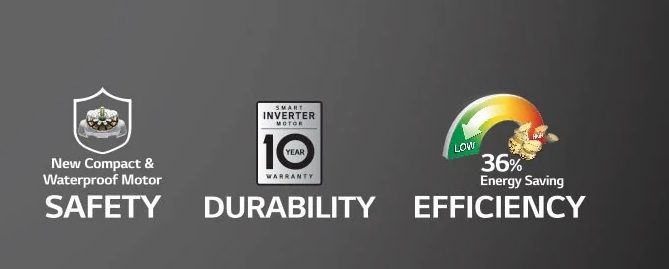 Smart Inverter is an energy saving technology that eliminates wasted operation by efficiently controlling energy use. Its revolutionary water proof motor doesn't corrode and is the most durable one in its league.