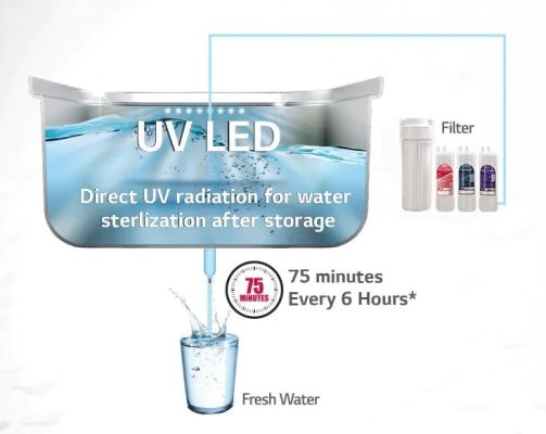 RO removes virus and bacteria; so there is no need of UV in the filtration stage. UV Cycle in LG True Water Purifiers runs during the Preservation stage. While the filtered water stored in Dual Protection Stainless Steel Tank is absolutely safe and clean to drink, The UV Cycle that automatically starts every 6 Hours.