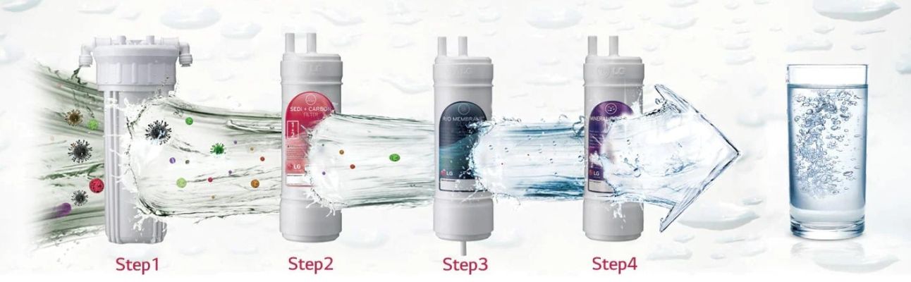 LG's advanced multi-stage reverse osmosis (RO) system delivers safe drinking water via a multi-stage filtration method that removes contaminants as minute as 0.0001 micrometers in size. RO filtration eradicates bacteria, viruses and heavy metals to provide incredibly pure drinking water.