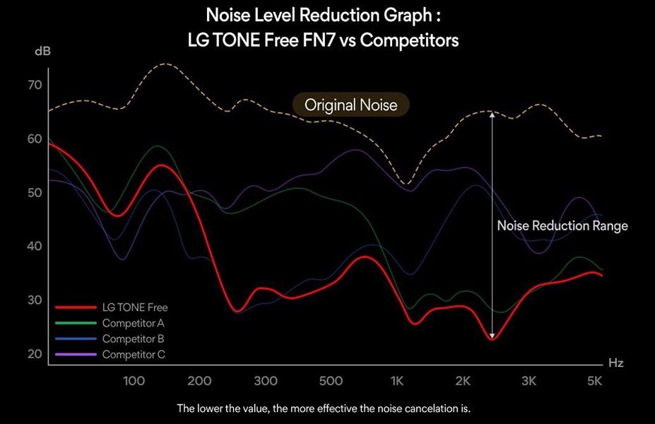 As shown on the graph below, the advanced LG TONE Free FN7 Active Noise Cancellation is effective at reducing the high-frequency noises we hear in our everyday lives, like conversations, cafe chatter, office noise, subway sound, and car horns. Freedom from these noises allows you to stay even more focused on your music and fully immerse yourself in authentic Meridian audio.