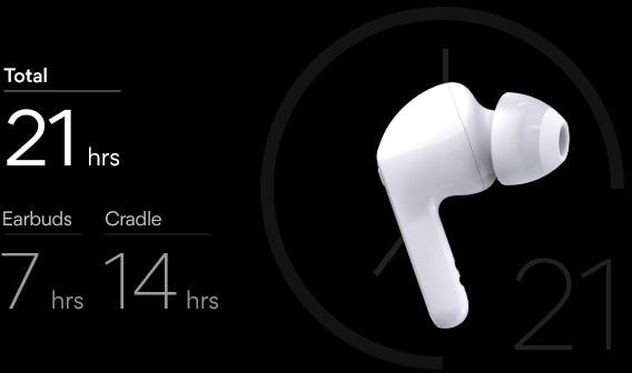 Enjoy a total of 21 hours of battery life. Up to 7 hours of playback in the earbuds turned on and an extra 14 hours in the cradle — all from one charge.