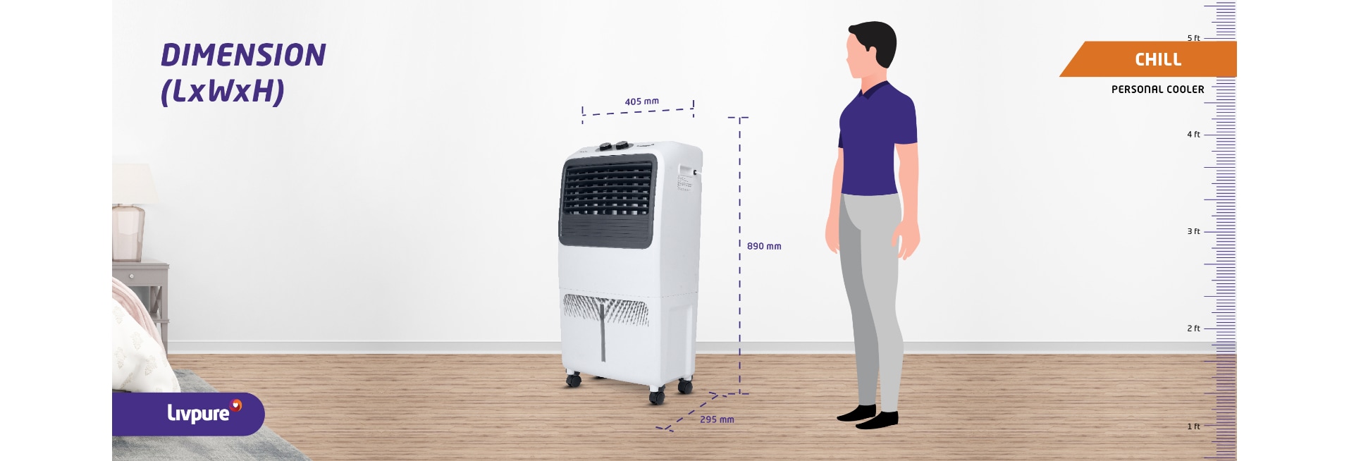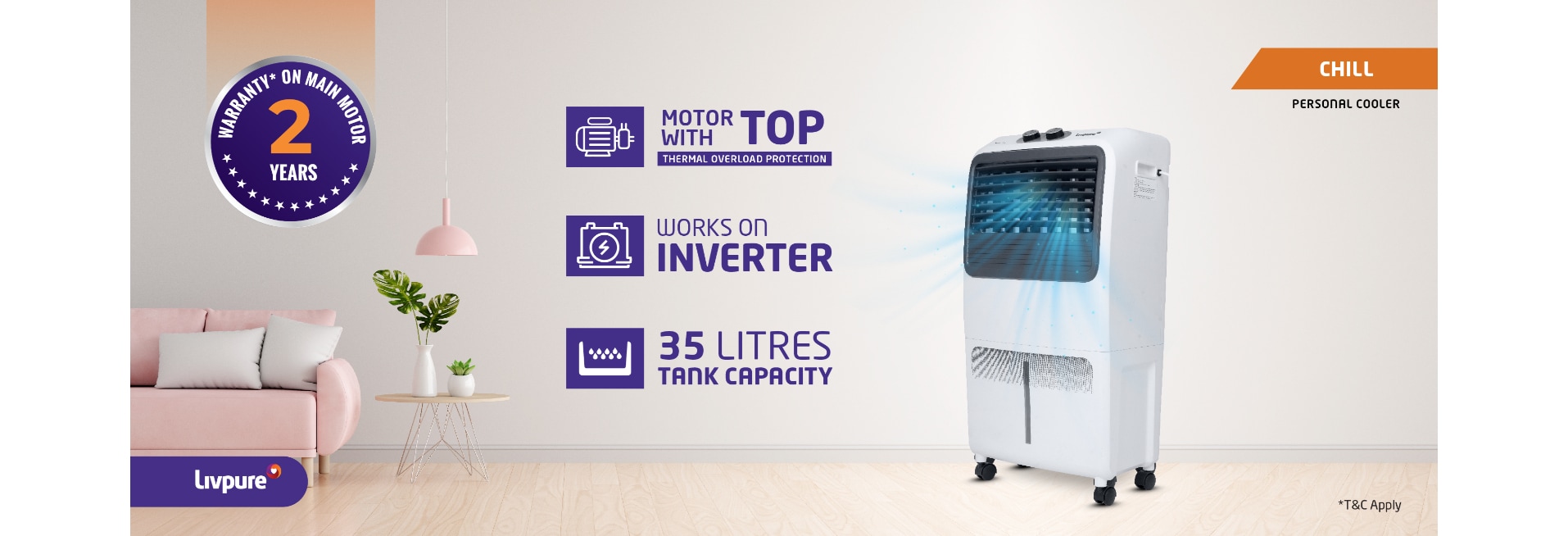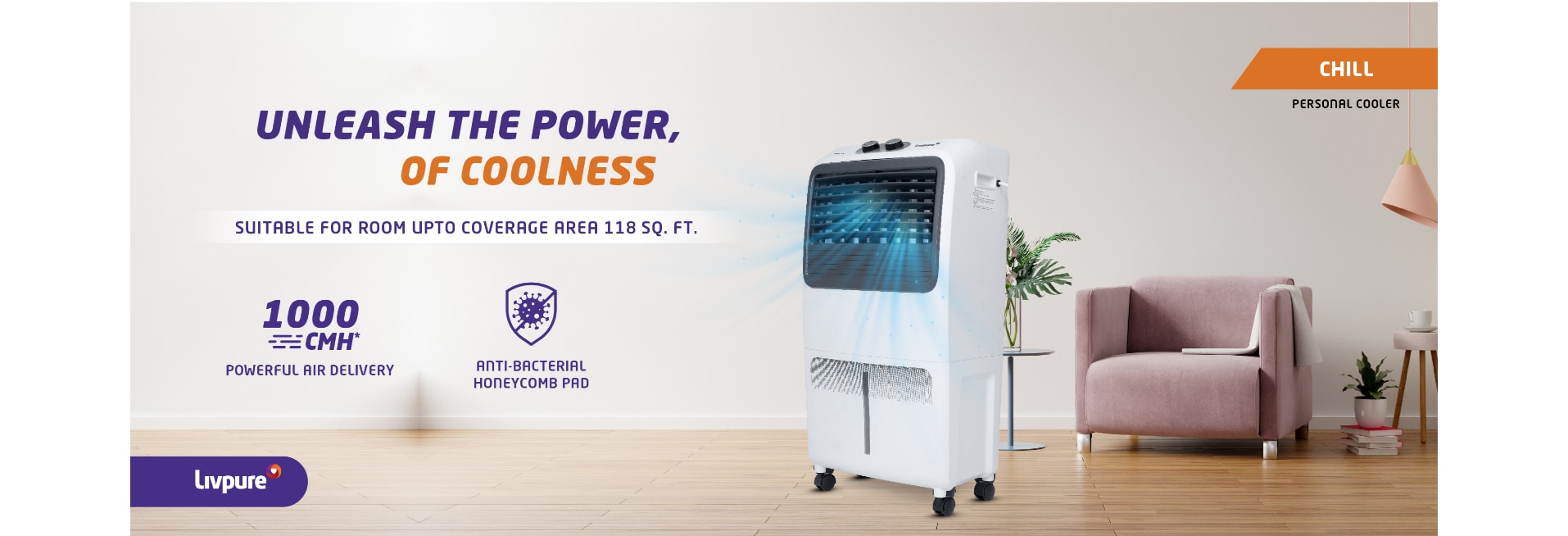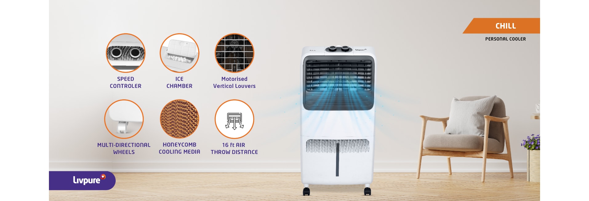 Livpure Chill 35L Personal Air Cooler with 1000 CMH Air delivery, 35 Litres, White & Grey