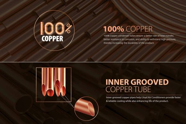 Bring home LLOYD's ACs with 100% copper that helps in fast flow of refrigerant, that has a better rate of heat transfer than conventional coils, can withstand high-pressure, is resistant to corrosion, has long term durability, and has low maintenance cost