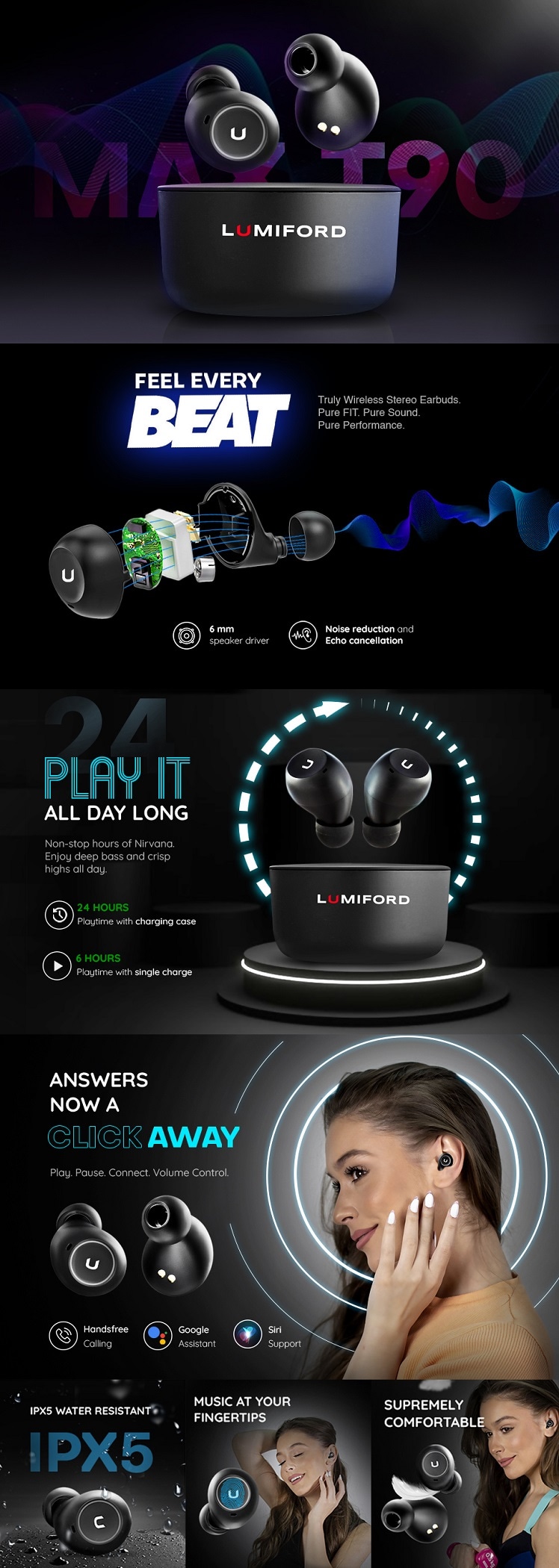 Lumiford Max T90 True Wireless Earbuds with Mic, IPX5 Water Resistant, Hands free calls, Noise Reduction (Black)
