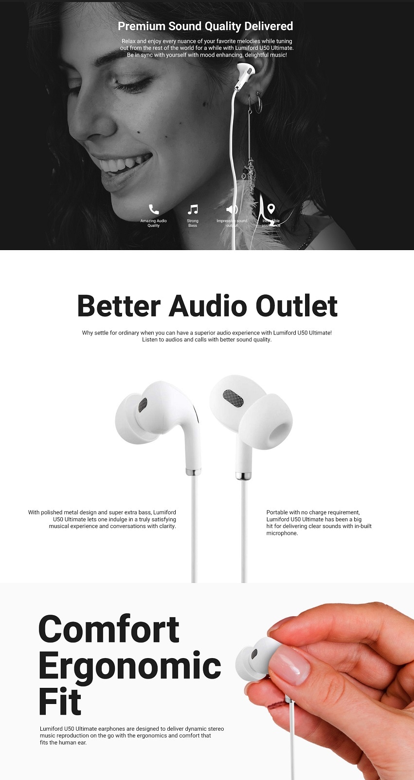 Lumiford Ultimate U50 in-Ear Wired Earphones with HD Mic, Stereo Sound, 10 mm Hi-Fi Bass Drivers (White)