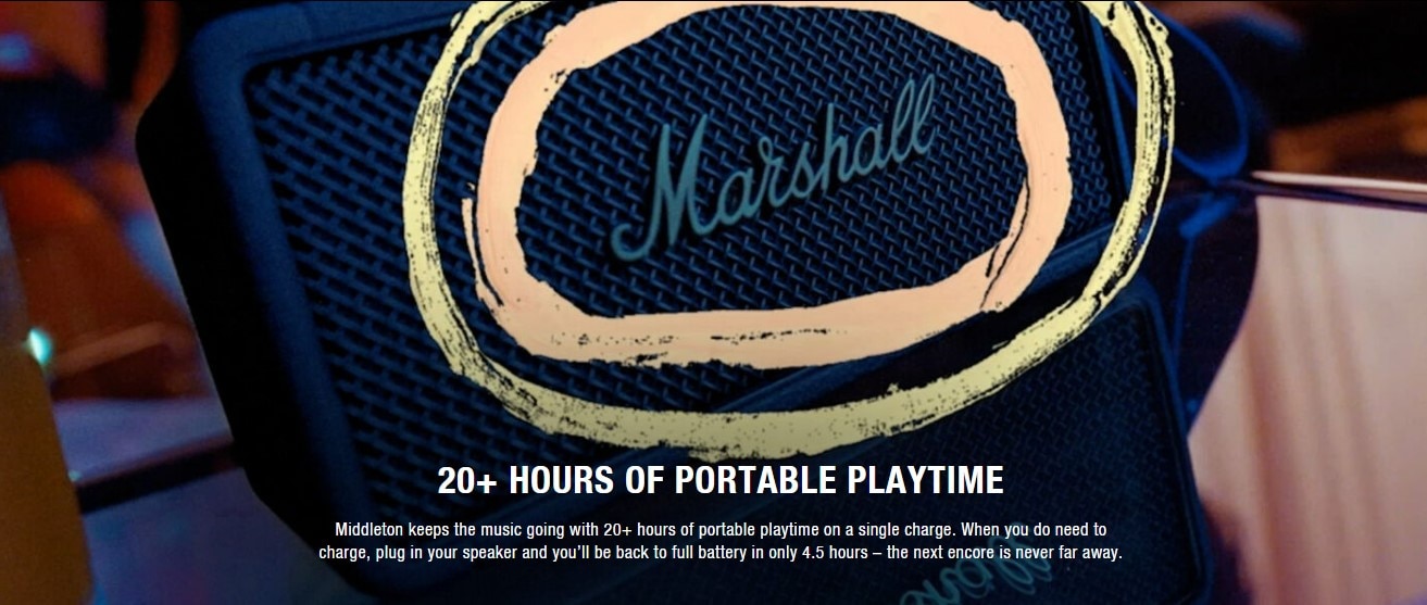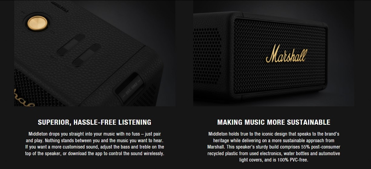 Marshall Middleton Portable Bluetooth Speaker, More than 20 Hours of Playtime, IP67, Stereo Mode, Quick charging, Black/Brass