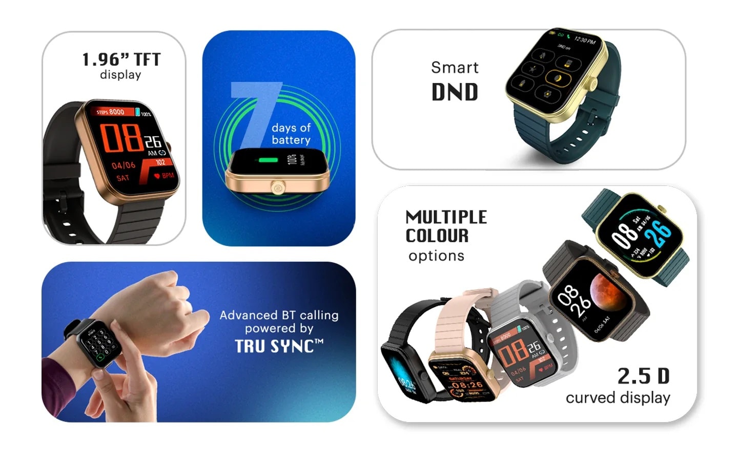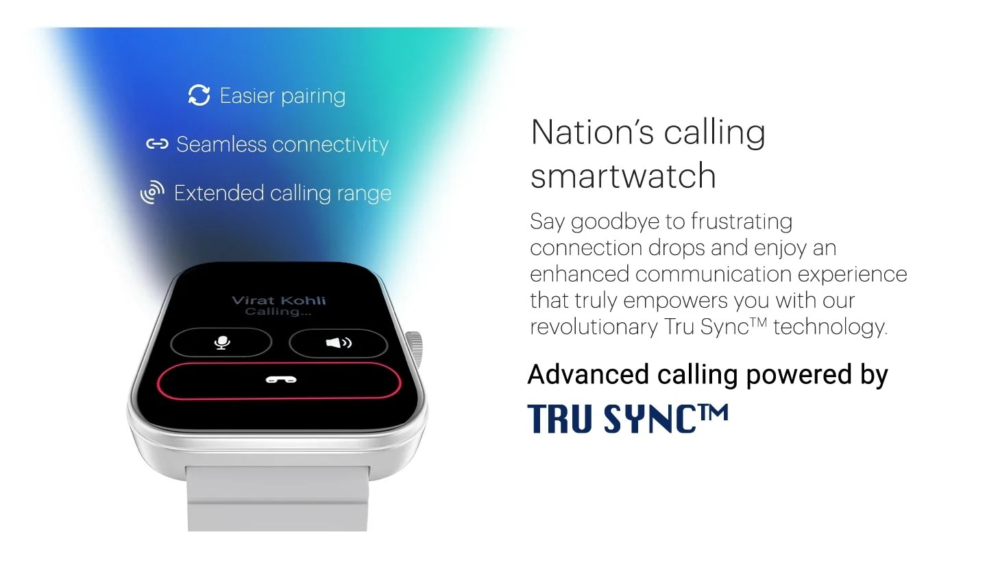 - Features to love: The smartwatch is equipped with advanced Bluetooth calling, powered by Tru SyncTM, which offers a superior calling experience. It also features a smart DND function that detects your sleep and disables notifications and alerts accordingly, ensuring uninterrupted rest. The smartwatch comes with a 2.5 D curved display that adds a touch of sophistication to your style