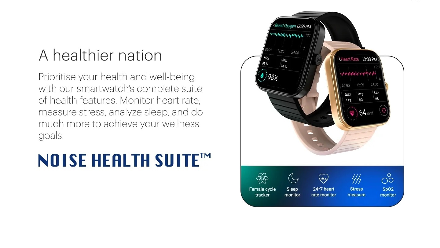 - NoiseFit app: Take charge of your fitness goals with the NoiseFit app - track your activity, complete challenges, compete with friends, and earn exclusive rewards and offers
