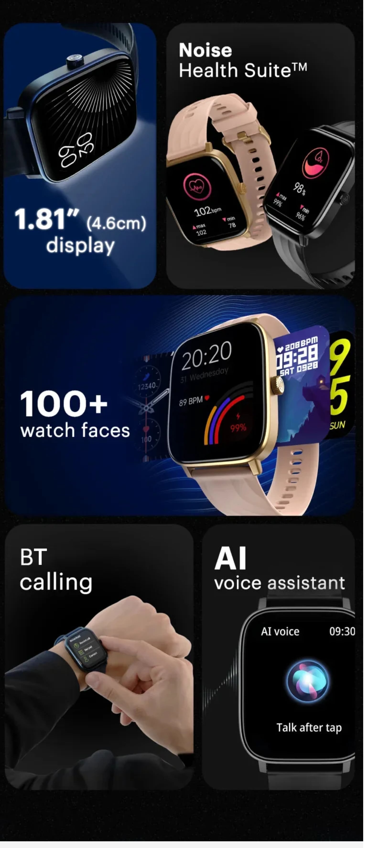 Pursue an active lifestyle with Noise Health SuiteTM, 100 sports modes and IP67 water resistance.