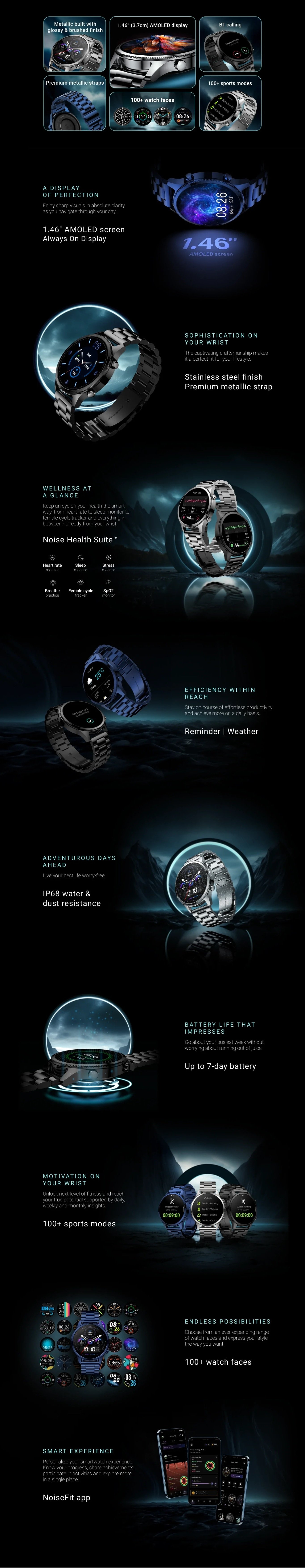 Noise NoiseFit Halo Plus, 3.7 cm (1.46 inches) AMOLED display with 466 X 466 px Resolution, Bluetooth Calling, 300 mAh Battery, 7 days of Battery Life, Female Cycle Tracking, IP68 Waterproof, Elite Black