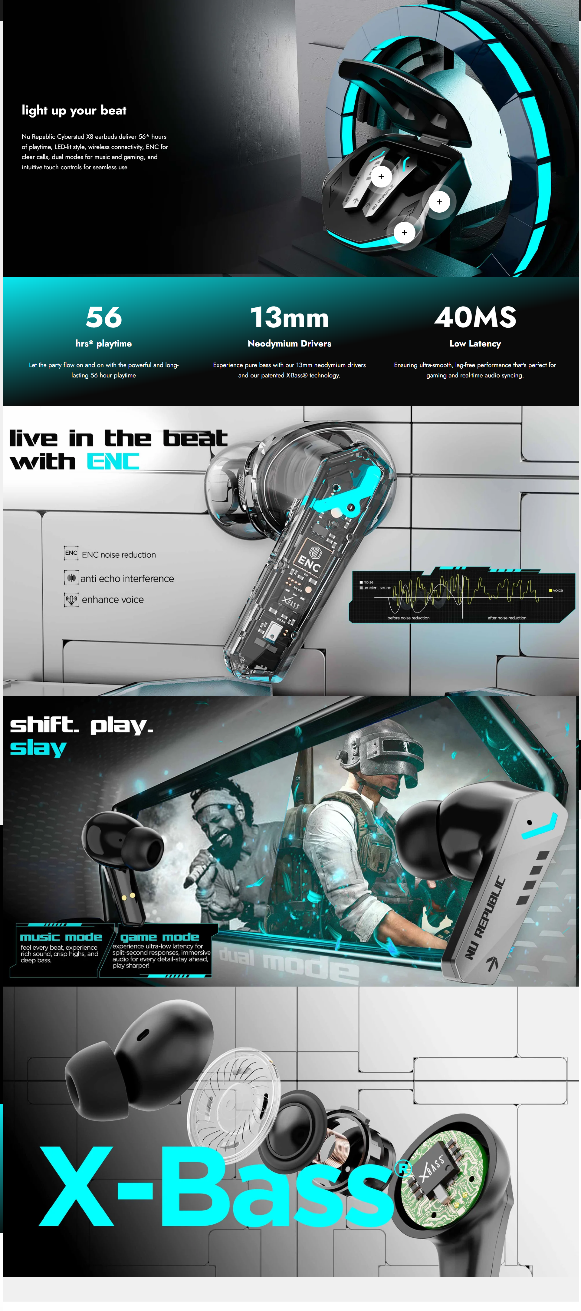 Nu Republic Cyberstud X8 TWS Wireless Earbuds with Up to 56 Hrs Playtime, 40 ms Ultra Low Latency, ENC Mics, 13 mm Neodymium Drivers, XBass Technology, Dual Mode for Gaming & Music, Bluetooth 5.3 (Silver)