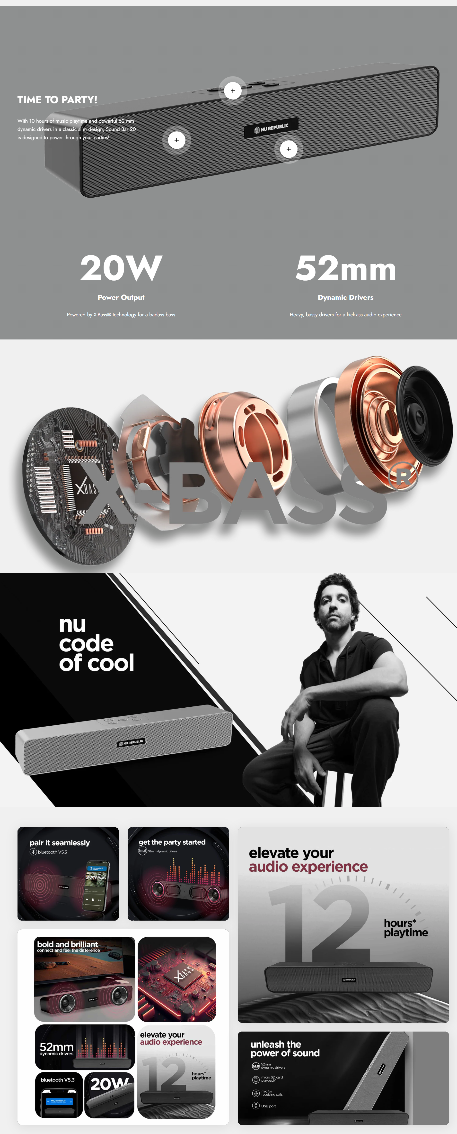 Nu Republic Soundbar 20 Bluetooth Soundbar with X-Bass Technology, 52mm Dynamic Drivers, Upto 12 Hrs Playtime, 20 W Output, Aux/USB Port (5.0 Channel (Black)