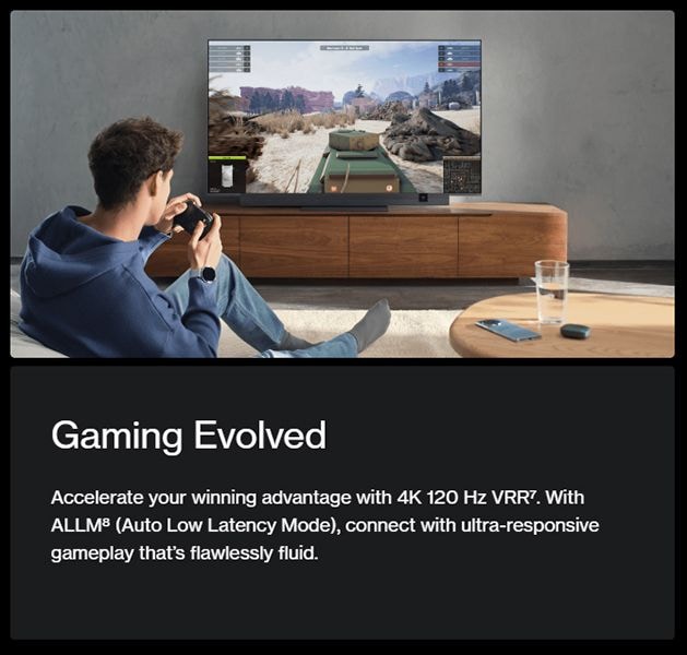 Advanced MEMC technology dials up the visuals. Frame rates are synced to the flagship display’s refresh rate for ultra-clear motion. A sublimely smooth native 120 Hz variable refresh rate² elevates visual content to new heights.