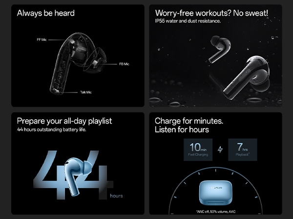 - [Battery Life]:It has 10mins of Fast Charging that give 7 hours of Playback time with total music playback upto 44 hours with ANC Off[IP55 rating]: With IP55 Dust and water resistance there is no fear of sweating or rain