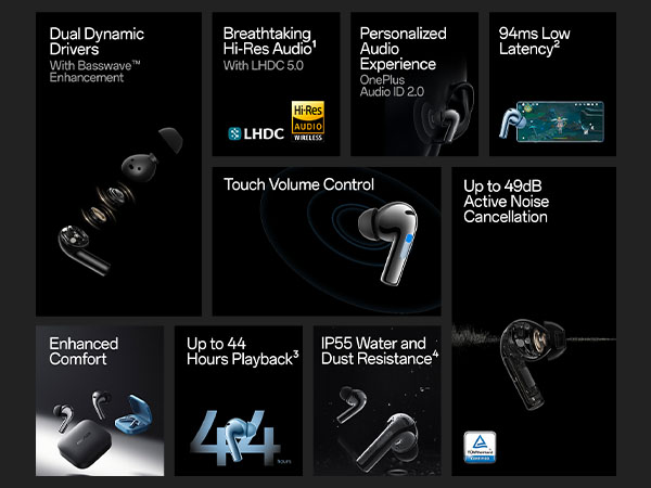 - [Best-in-class Sound Quality]: 10.4mm+6mm dynamic dual driver, LHDC5.0 Bluetooth CODEC and high resolution certification makes the product best in its sound quality with deeper bass, delicate treble and clear vocals; [Sliding Volume Control]: Slide on the surface of touch area of buds to adjust the volume.Sliding up increases the volume, while sliding down decreases the volume