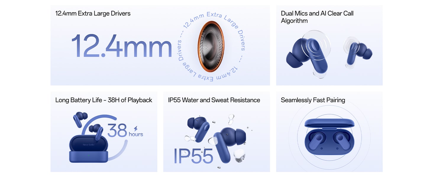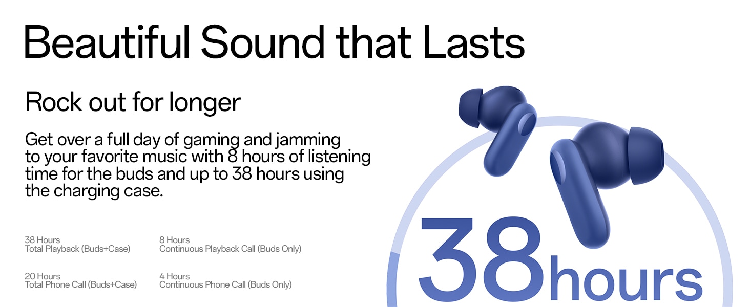 - [Battery Life]:The flagship-level battery life for the all-new OnePlus Nord Buds 2r delivers up to 38 hrs of non-stop music on a single charge.; [IP55 rating]: IP55 Water & Sweat Resistance