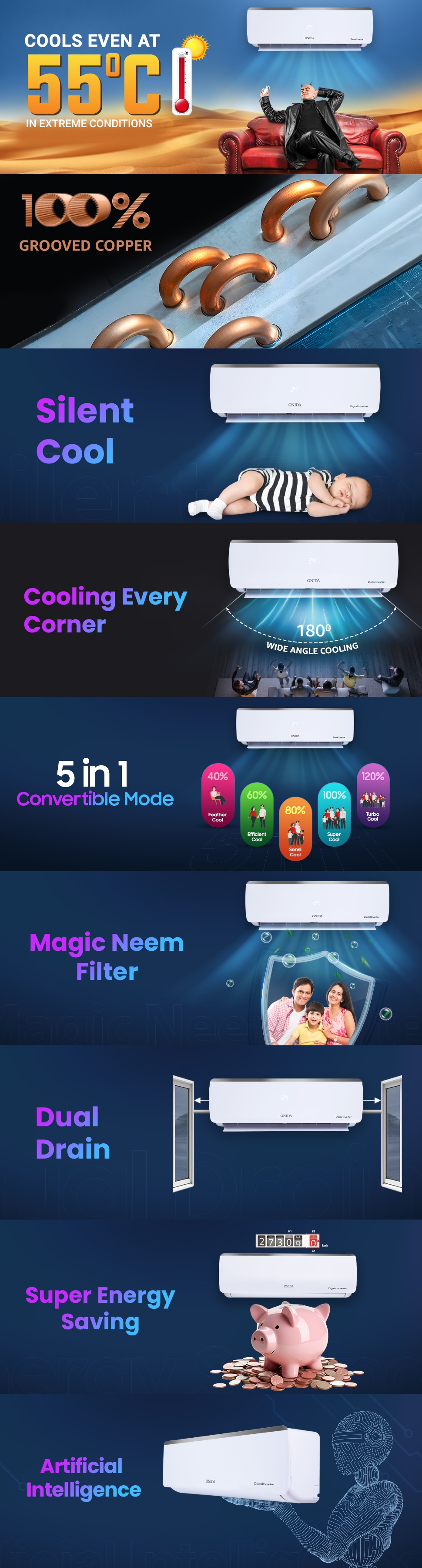 Onida 1.5 Ton 3 Star Split Invertor Air Conditioner, IR183RGS, White (Four Way Cooling, 5 IN 1 Covertiable, Auto Clean, Water Drain Both Sides, 2025 Launch)