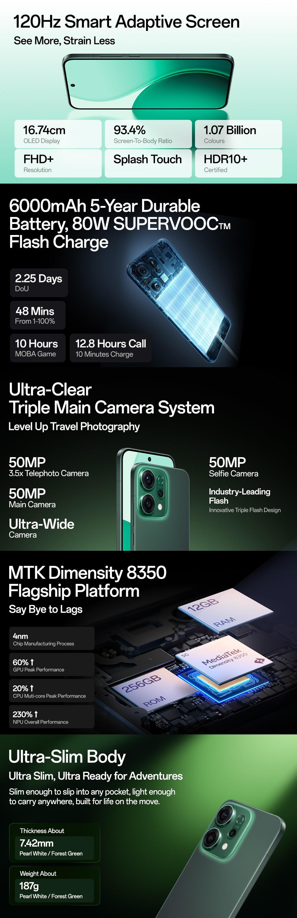Oppo Reno 14 5G 256 GB, 8 GB RAM, Mint Green, Mobile Phone