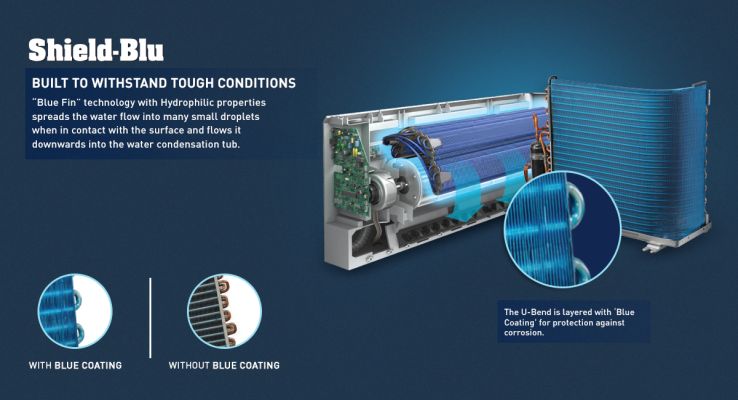 Built to withstand tough conditions. “Blue Fin” technology with hydrophilic properties spreads the water flow into many small droplets when in contact with the surface and flows it downwards into the water condensation tub.