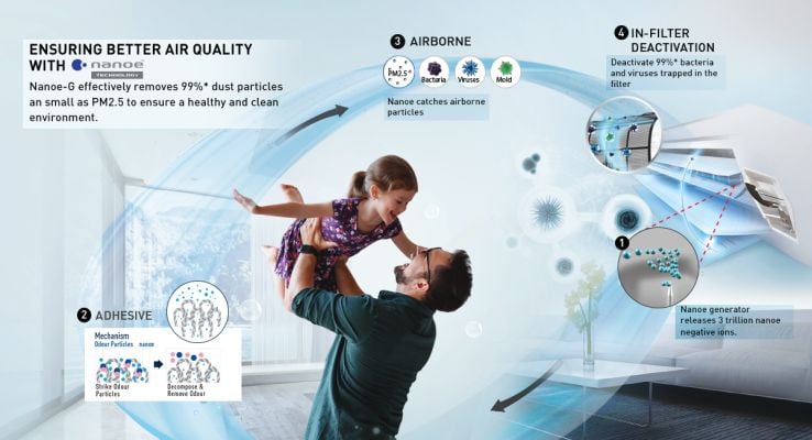 Nano-G effectively removes 99% dust particles as small as PM2.5 to ensure a healthy and clean environment.It generates 3 trillion nanoe negative ions. Nanoe catches airborne particles. It deactivates 99% bacteria and viruses trapped in the filter