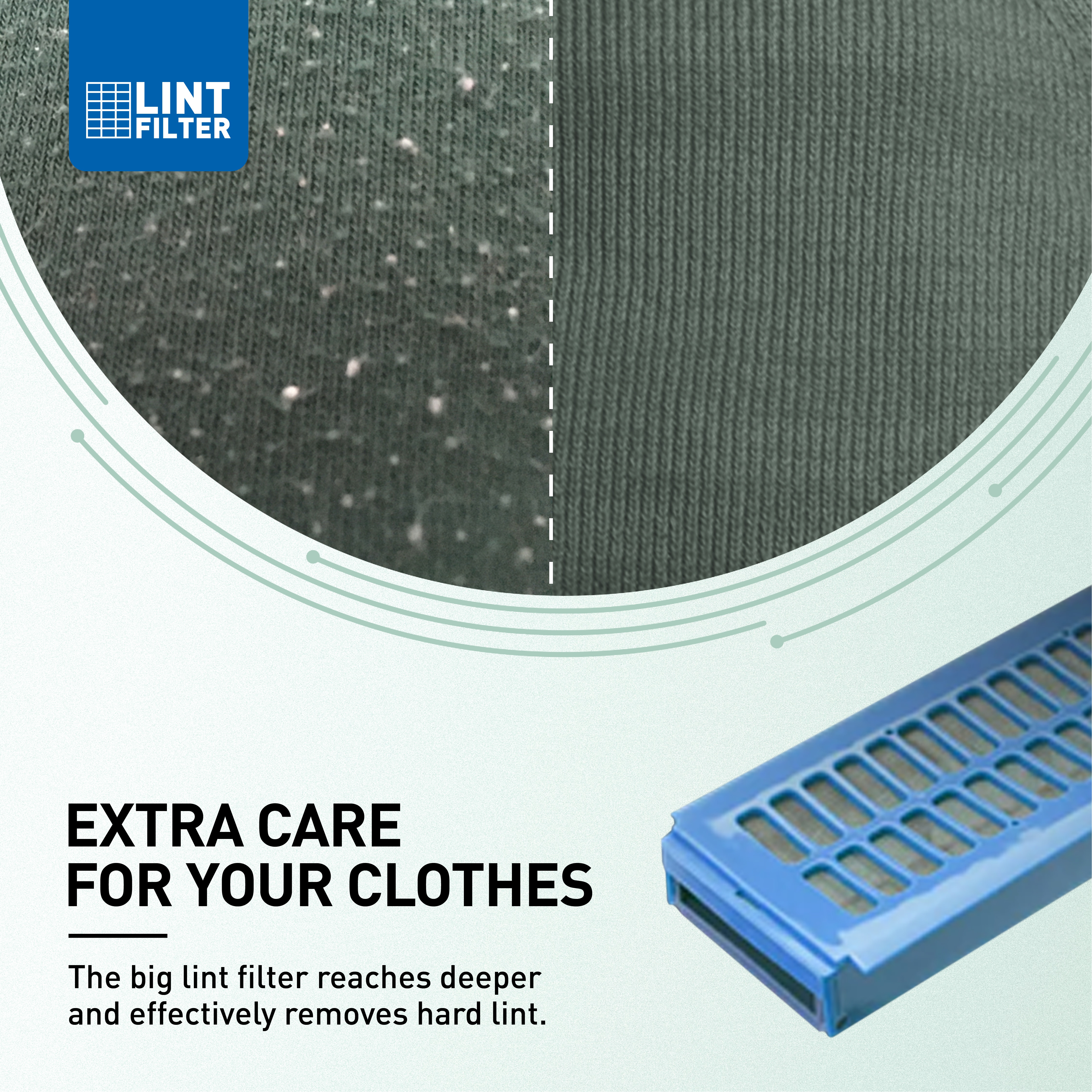 Large capacity lint filter is Installed to ensure effortless cleaning. It can hold plenty of lint and hard-to-remove lint can be easily washed away with water easily.