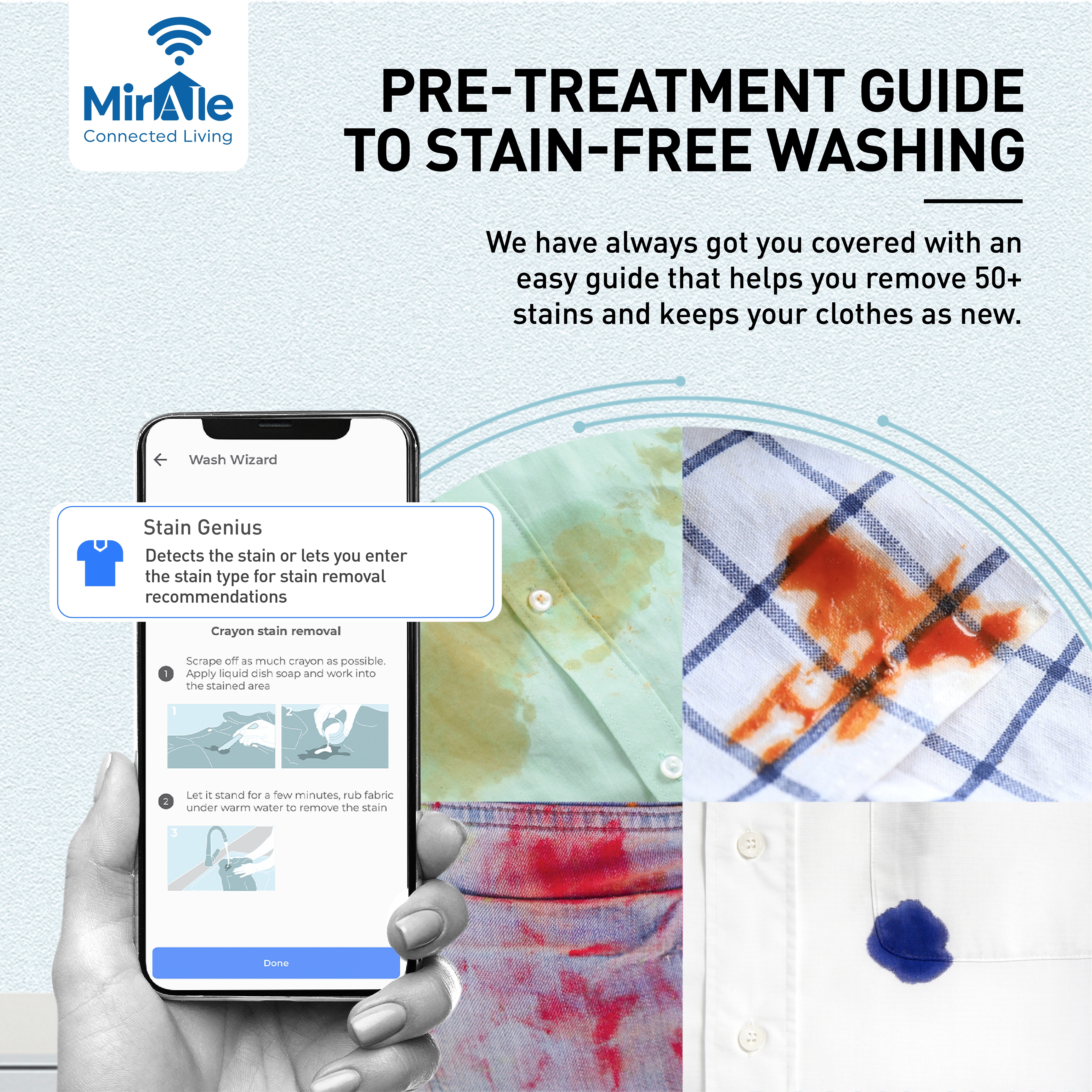 Wear those sparkling white clothes without a worry. The Stain Genius feature gives you a comprehensive pre-treatment guide customized to fight different types of stains. Users can click pictures of stains & MirAIe cloud will recognize the stain and specify with confidence levels along with a recommendation for pre treatment.