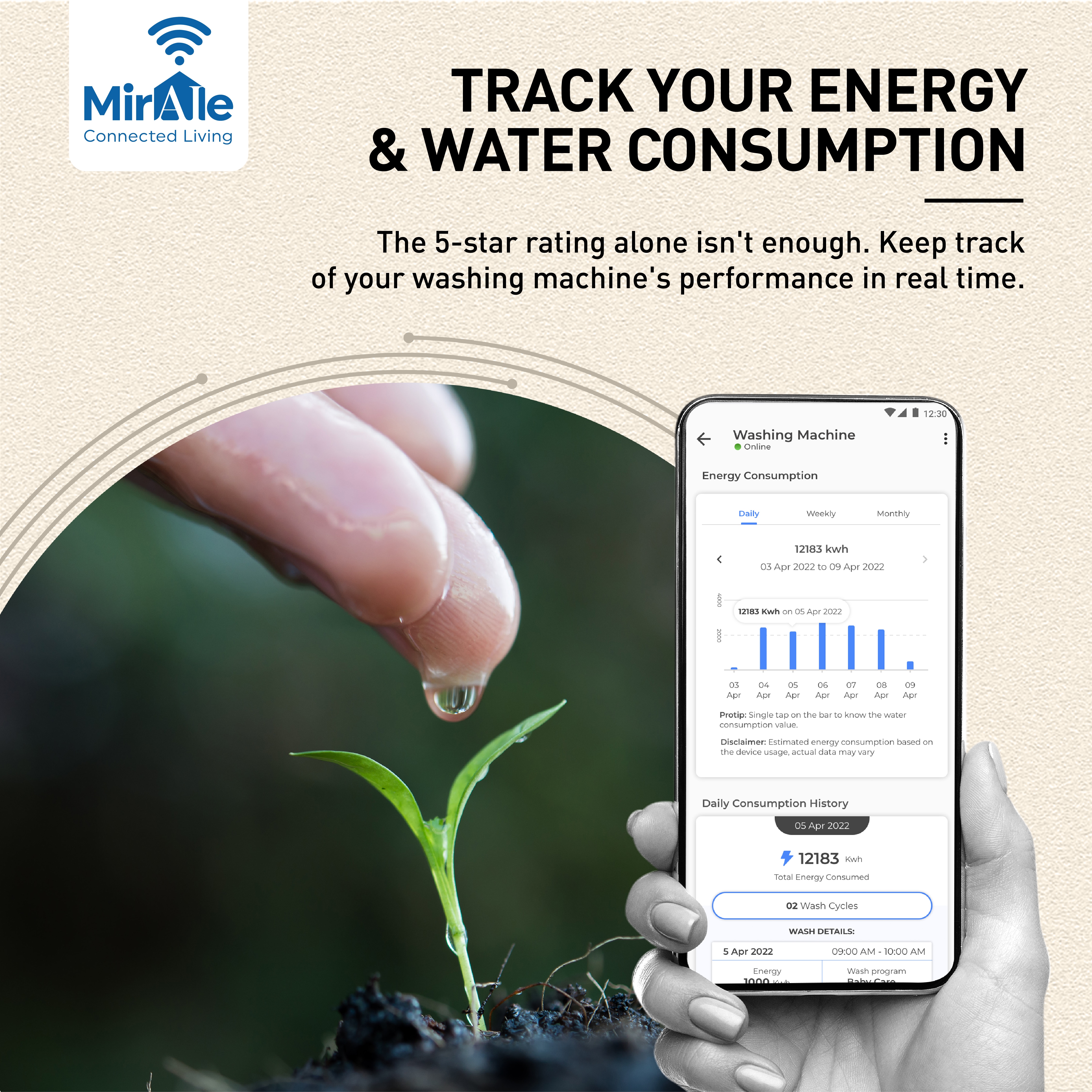 Conveniently track and tap the power and water consumption of your washing machine through the MirAie app.