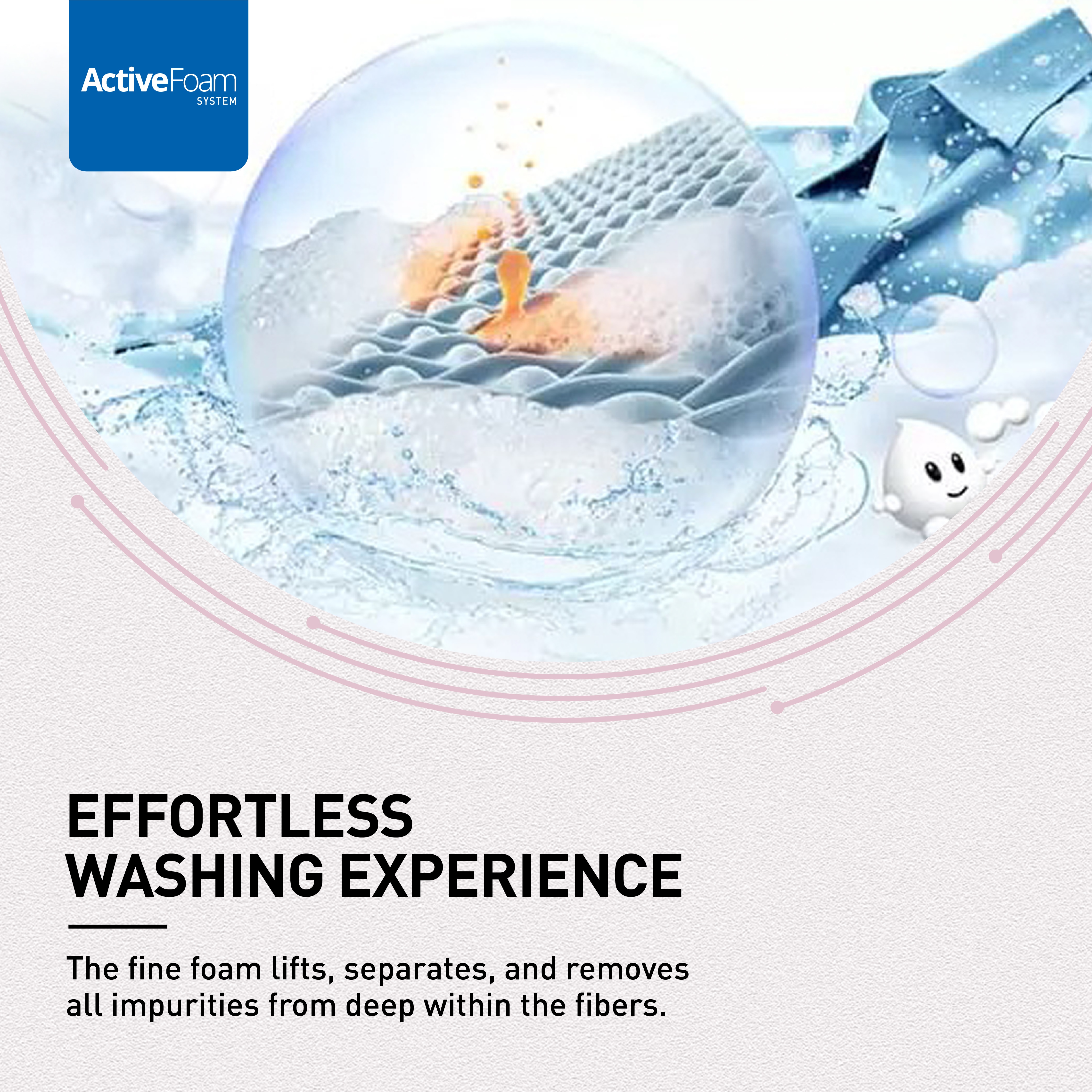 The Active Foam System creates fine, high density foam before the washing cycle starts. Fine foam lifts, separates and removes dirt from deep in fibers.