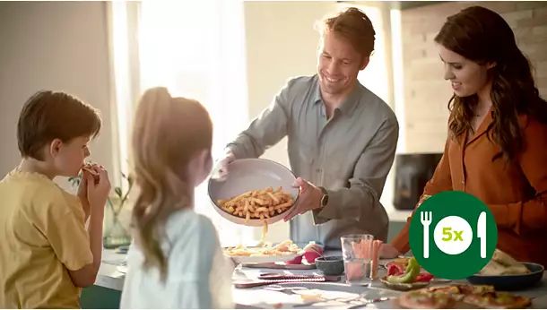 The Philips Airfryer XL is designed with your family in mind. The 1.2Kg capacity basket, combined with the 6.2L pan, help you cook a variety of meals. Make up to 5 meal portions in one go for your family and friends.