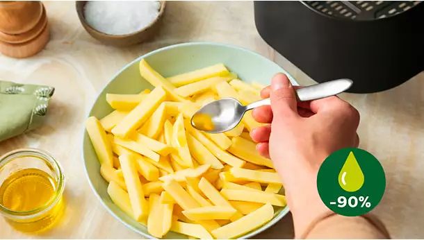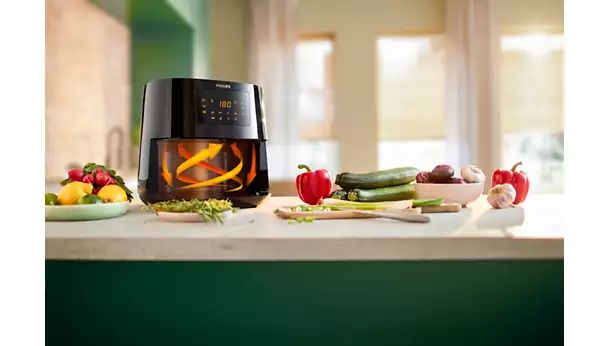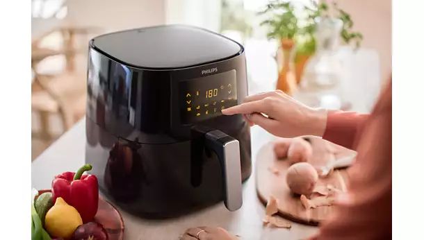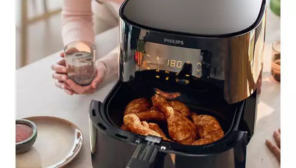The Philips Essential Airfryer uses hot air to cook your favorite foods to crispy perfection, with up to 90% less fat.