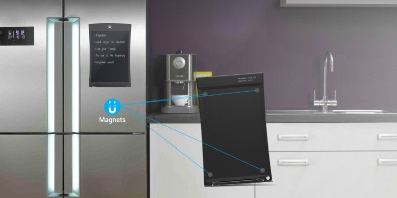 LCD writing pad comes with magnets on the backside so that you can stick it to any metal Dots.