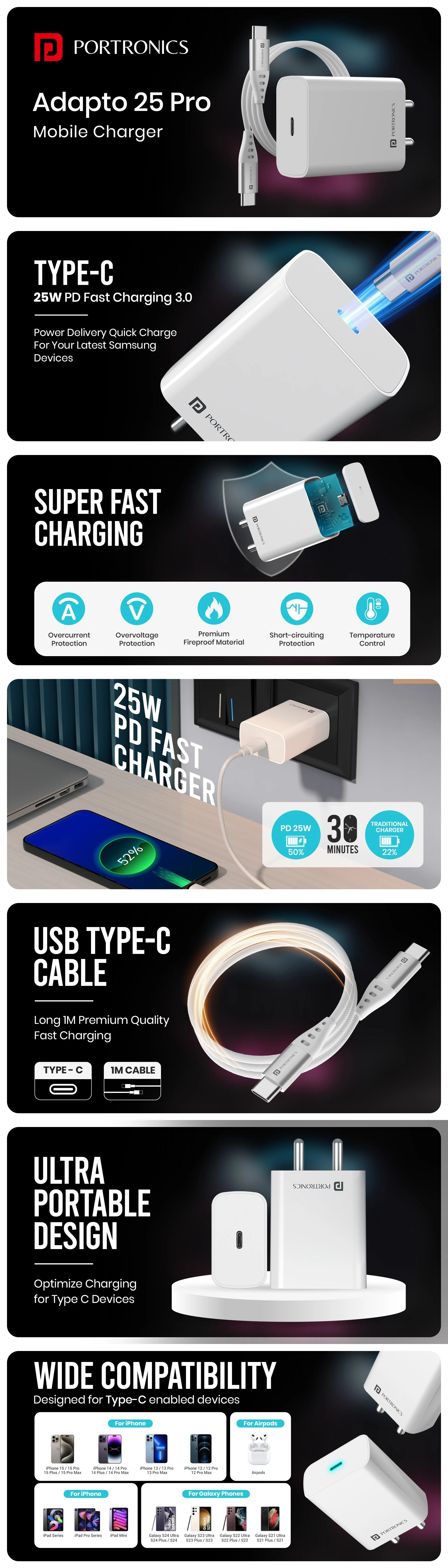 Portronics Adapto 25 Pro 25 W Fast Charging Type C Adapter, White