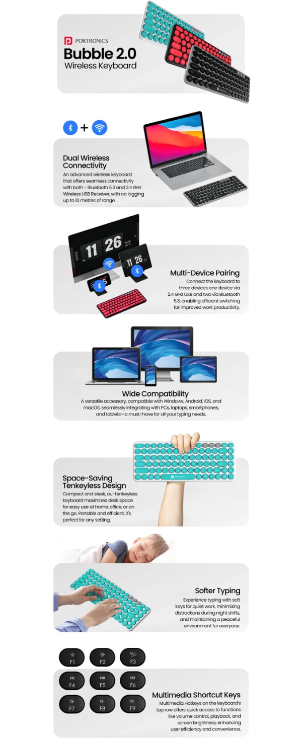 - Dual Wireless Connectivity Modes: Portronics Bubble 2.0 is an advanced wireless keyboard that offers seamless connectivity with both - Bluetooth 5.3 and 2.4 GHz Wireless USB Receiver, with no lagging up to 10 metres of range.