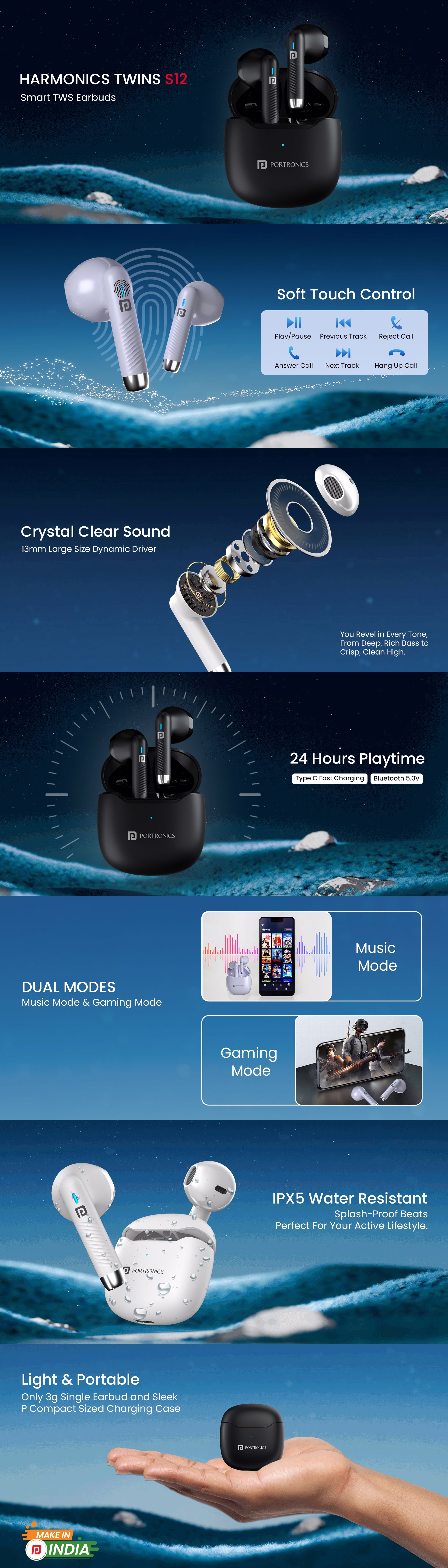 Portronics Harmonics Twins S12 in Ear True Wireless Earbuds with Mic, 24 Hours Playtime, Game/Music Mode, Touch Control, 13 mm Dynamic Driver, Bluetooth v5.3, IPX5 Water Resistance & Type C Fast Charging (Red+Black)