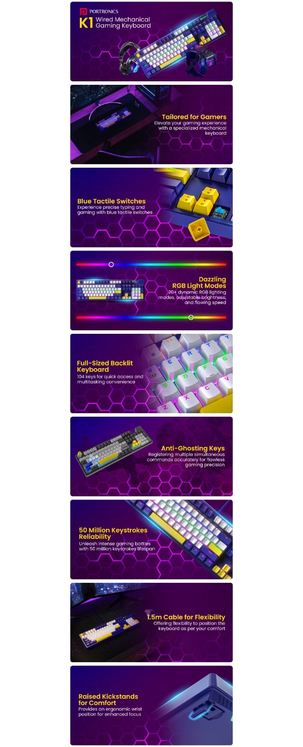 - Mechanical Gaming Keyboard: Dominate your opponents easily with Portronics K1, a keyboard designed especially for gamers. This keyboard with multicolored keys, RGB lights and more is a perfect addition to your gaming setup.