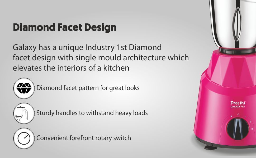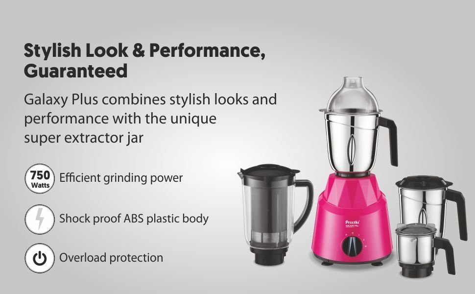 Preethi Galaxy Plus 750 Watt Mixer Grinder with 4 Stainless Steel Jar, Pink