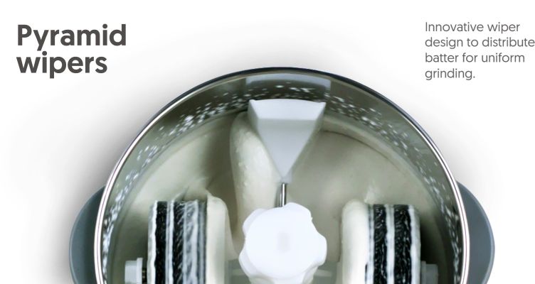 Pyramid Shaper Wiper- Specially designed pyramid-shaped wiper helps to direct the ingredients to the grinding zone for uniform grinding of the batter.