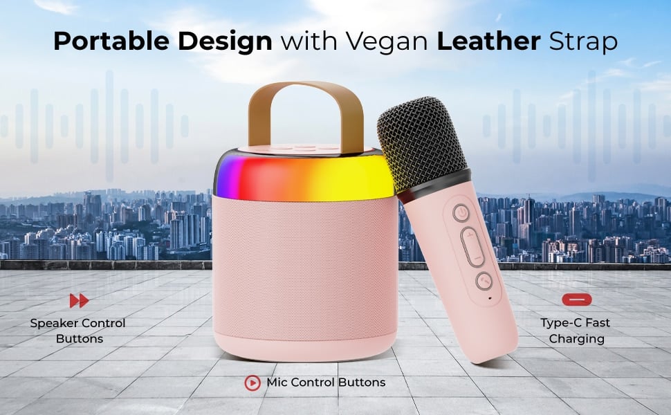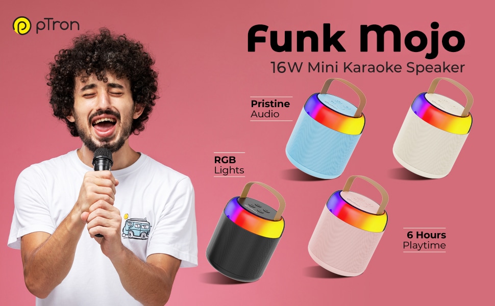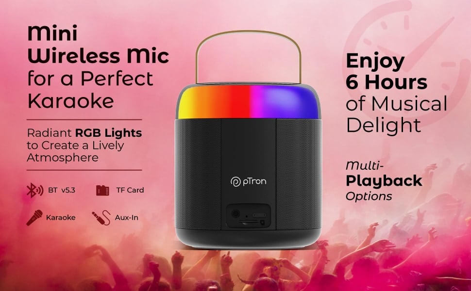 pTron Funk Mojo 16 W Mini Bluetooth Speaker with Wireless Karaoke Mic, 6 Hrs Playtime, Colorful RGB Lights, Funny Voice Effects, Multi-Play Modes BT v5.3/TF Card/Aux-in, Lightweight & Portable & Type-C Charging Port (Black)