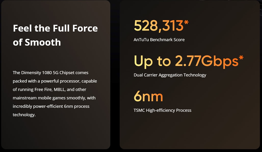 - MediaTek Dimensity 1080 5G Octa-Core Processor