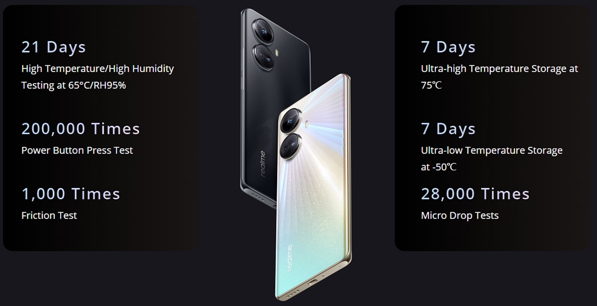 The realme 10 Pro+ 5G incorporates 0.65mm double-reinforced glass, making it durable enough to pass the stringent TTF 1.5m drop test and 28,000 micro drop tests. This is a phone you can use worry-free.
